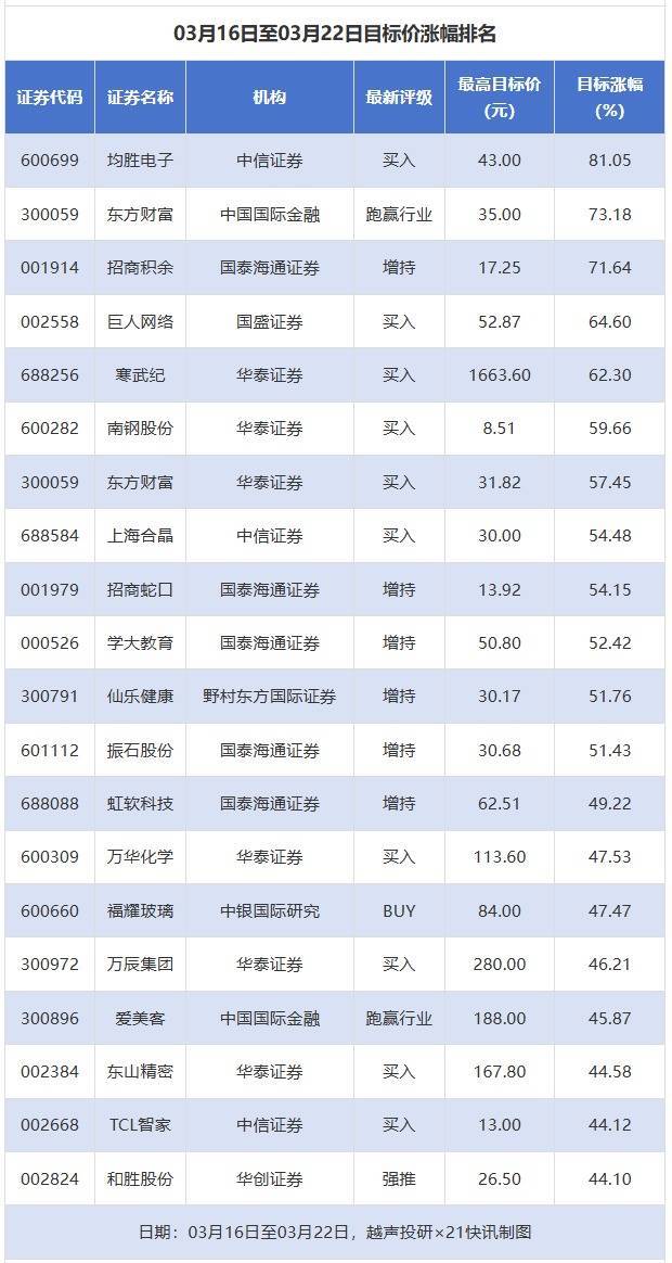 越声投研数据显示,3月16日至3月22日,券商给予上市公司目标价共90次,按最新收盘价计算,目标价涨幅排名居前的公司有均胜电子、东方财富、招商积余,目标价涨幅分别为81.05%、73.18%、71.64%,分别属于汽车零部件、证券、房地产服务行业。
