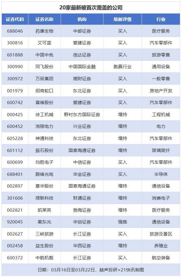 首次覆盖方面,3月16日至3月22日券商共给出了63次首次覆盖,其中药康生物获得中邮证券给予“买入”评级,艾可蓝获得爱建证券给予“买入”评级,中国中免获得信达证券给予“买入”评级,同飞股份获得中国国际金融给予“跑赢行业”评级,万辰集团获得湘财证券给予“买入”评级。