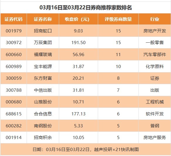 从券商推荐家数来看,3月16日至3月22日有194家上市公司得到券商推荐,其中招商蛇口获得15家推荐,万辰集团获得15家推荐,福耀玻璃获得11家推荐。