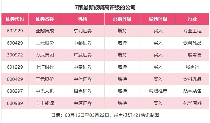 评级调高方面,3月16日至3月22日,券商调高上市公司评级达到7家次,最新数据包括了东北证券对亚翔集成的评级从“增持”调高至“买入”,中邮证券对三元股份的评级从“增持”调高至“买入”,广发证券对万辰集团的评级从“增持”调高至“买入”。