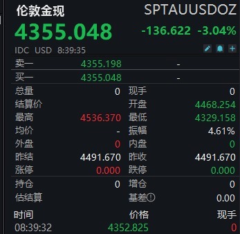 【大河财立方消息】3月23日,伦敦金现跳水,跌幅超过3%,失守4400美元/盎司,报4355.048美元/盎司。